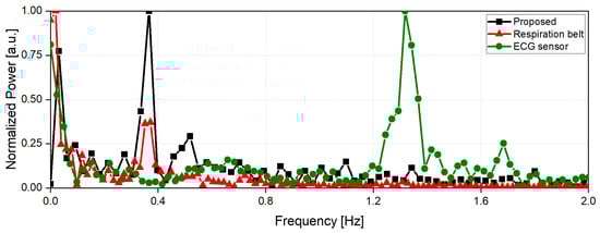 Frequency spectra of the vital signals measured by using the reference sensors (a respiration belt and an ECG sensor) and the proposed radar configuration at the LOS angle of 30°.