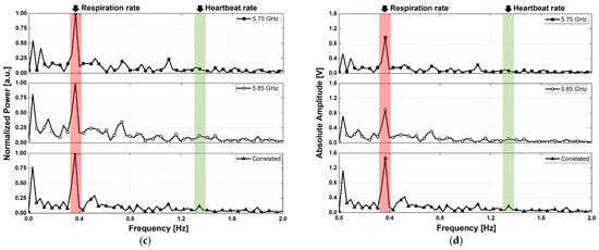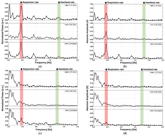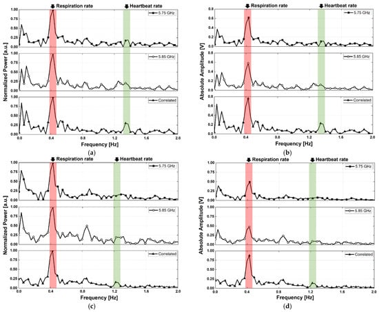 Measurement results using the proposed radar configuration in the experiment with a measurement angle of 60°: (a) normalized spectrum obtained in the motionless condition; (b) spectrum displayed with the absolute amplitudes of signals in the motionless condition; (c) normalized spectrum obtained in the presence of human body movement; (d) spectrum displayed with the absolute amplitudes of the signals in the presence of human body movement.