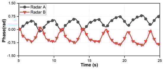 The measurement results in the motion of the subject in Figure 12d, Figure 13d and Figure 14d show that the proposed configuration and processing increase the absolute amplitudes of the vital signals and decrease the motion-induced noise. The amplitude and phase of the vital signals obtained from the two radars should be different because of the asymmetrical movement of the human organs to simultaneously realize a decrease in noise and an increase in the vital signals. The different amplitudes and phases between the vital signals obtained from the two radars show that the asymmetric movement of human organs affects vital signal detection using the radar. In particular, the phases of the vital signals x1(t) and x2(t) acquired simultaneously by two radars should not be the same to increase the amplitude of vital signals by the proposed signal processing method explained in Section 2. Figure 15 shows the phase waveforms of vital signals acquired simultaneously and independently from the two radars. The waveforms of the simultaneously sampled data show that the phases of the vital signals have a difference of 180° in the proposed configuration. This is caused by the asymmetrical characteristics of vital signals in the radar because of the presented phase differences in the measurement results, regardless of the LOS angles.