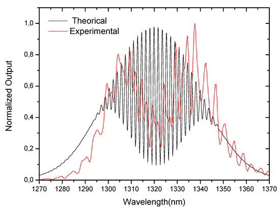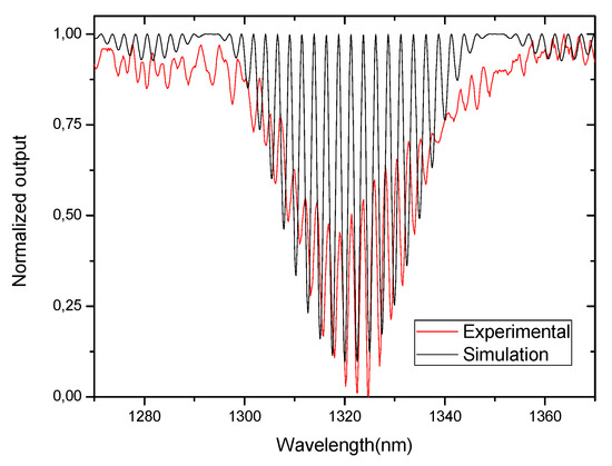 where is the effective refractive index difference between the core and the cladding and Lcav is the physical length of the fiber after the LPG. The resulting output spectra for Lcav ~140 mm, a LPG modulation period of 439 μm and can be observed in Figure 2, obtained from Equation (12). In the same figure, the spectrum obtained experimentally for a Michelson interferometer with the same characteristics is shown.