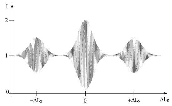 where I0 is the average optical power arriving at the detector, I1, I2, I3, I4 are the normalized intensities of each term in Equation (18) and |γ(∆L)| is the absolute value of the normalized source autocorrelation function. For a low-coherence source the autocorrelation function usually has a Gaussian profile given by [44]: