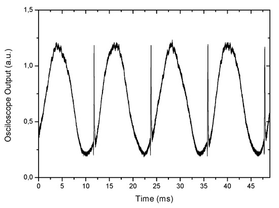 The typical output of the detector signal given by Equation (20), when the receiver interferometer is in conditions or , the read in an oscilloscope is shown in Figure 9. In Figure 9, it is possible to see fast feedback due to the discontinuity of the ramp signal. The typical output signal from the lock-in amplifier when reading the phase of the pseudo-heterodyne carrier is between −180° and 180°, but the phase change is beyond those limits. Therefore, immediately after reaching a value of 180 it changes abruptly to −180. This causes an ambiguity in the output, and one needs a procedure in order to determine the point where there is the jump in the lock-in phase. Thus, after the data collection, 360 degrees has to be added every time there is a jump in phase. Then, the final phase is obtained by multiplying the number of phase jumps (N) by 360 degrees, plus the value of the phase before the jump, given by