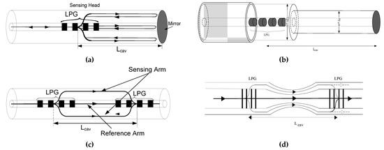 In the manuscript, the sensing properties of modal interferometers with Michelson and Mach–Zehnder topologies, associated in several cases to LPGs fabricated by the electric arc technique and phase demodulation, using an interferometric heterodyne interrogation approach for optical signal processing, was explored. It should be stressed that the choice of the LPG’s fabrication technique resides in the fact that it is a well stablished technique at INESC TEC, being low cost and versatile, enabling the fabrication of LPGs in virtually all kinds of fiber, as well as other devices, such as tapers [32]. On the other hand, arc-induced gratings can be fabricated in order to intrinsically increase their sensitivity to physical parameters such as strain, bending and external refractive index by changing the depth of the microdeformation and also due to the fact that coupling occurs to asymmetric cladding modes, which enhances the interaction of the mode field with the surrounding medium when the grating is bent [33,34].