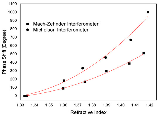 From the analysis of Equations (8) and (13), the phase difference for the two optical configurations is expressed in slightly different ways. This difference depends on the configuration of the interferometer, verifying that the sensitivity of the Michelson interferometer is twice that of the Mach–Zehnder interferometer. This doubling of the sensitivity is due to the fact that in the case of the Michelson interferometer the light passes twice on the same path.