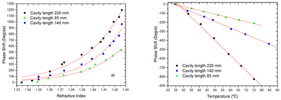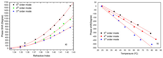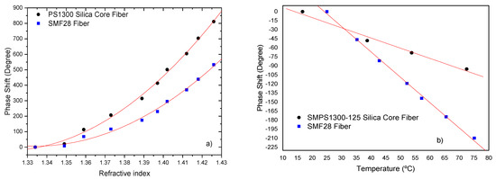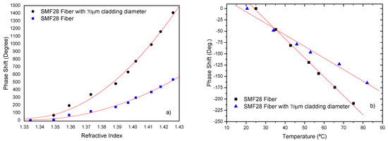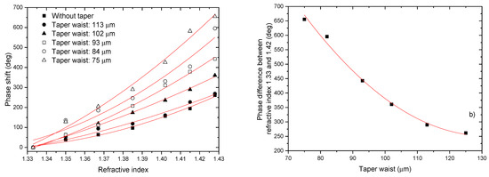 The sensitivity increase with the reduction of the waist diameter is evident, as is better expressed by the data shown in Table 2, which gives the phase difference versus taper waist diameter when the refractive index changes from 1.33 to 1.43. Indeed, when using a taper with a waist diameter of ~75 μm, the sensitivity increases by a factor of ~1.7 when compared to the case of using a taper with a waist diameter of ~100 μm.Although the sensitivity of the Mach-Zehnder interferometer is lower than the Michelson one with the same cavity length, there are applications where it is advantageous to use Mach–Zehnder configurations. Thus, it will be useful to study processes that can increase the sensitivity of Mach–Zehnder interferometers. One possibility is to explore the antisymmetric nature of cladding modes in LPGs induced in SMF-28 optical fiber by the electric arc technique [68] to enhance and control the sensitivity to external refractive index changes in LPG-based Mach–Zehnder interferometers by a simple mechanical action on the fiber interferometer, bending the fiber of the modal interferometer.