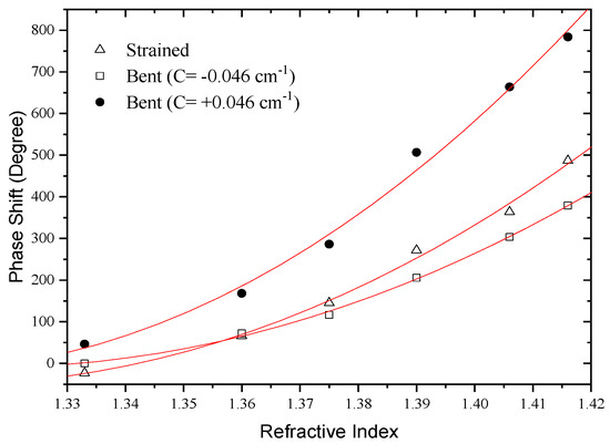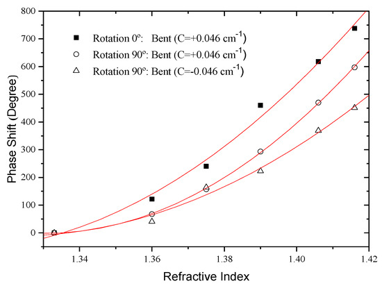 In fact, when the fiber is bent, the effective indices of the core and cladding modes are affected differently by the photoelastic effect [69,70] and, more important in the present context, the curvature can induce a larger evanescent field of the cladding mode in the external medium, with the consequent sensitivity enhancement to changes of its refractive index.