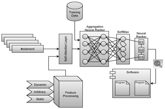 The proposed ABNR model works are mechanized to identify the features based on the significance using the self-attention layer through the weighted approach, and aggregation is performed in the neural ranking process. The statements are then ranked based on the severity of the vulnerability using the softmax layer of the neural ranking model [32]. The block diagram of the proposed model is presented in Figure 2 [33]. The code snippets that are the part of the software program are fed as the input for the neural ranking model. The neural ranking model identifies the features from the data and assigns the weights to the features based on the importance of those feature in the fault determination. The features are then correlated with the features that are already trained to the model using the feature map and the probabilities are assessed. Then based on the probabilities the ranks are provided to the statements.