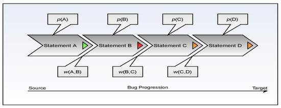 To better understand the process flow of the fault localization model, consider the following diagram, which has four statements in the snippet labeled A, B, C, and D, in which the erroneous origin statement is depicted by A. Statement D represents the data-receiving destination. It is believed that the intermediate statements are located between the statements and the nodes intended to be reached by the data. The fault rank is used to determine the vulnerability associated with each corresponding statement. This procedure is described in detail in Equations (18)–(23).