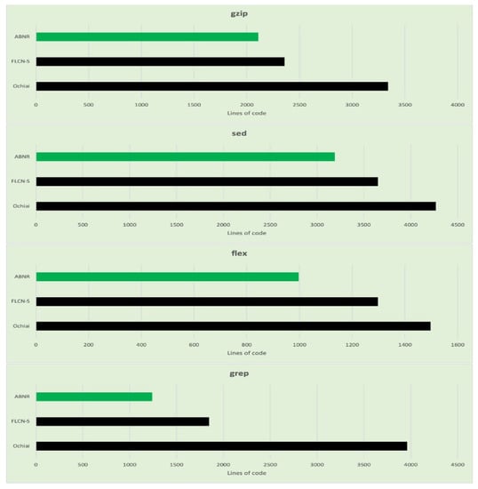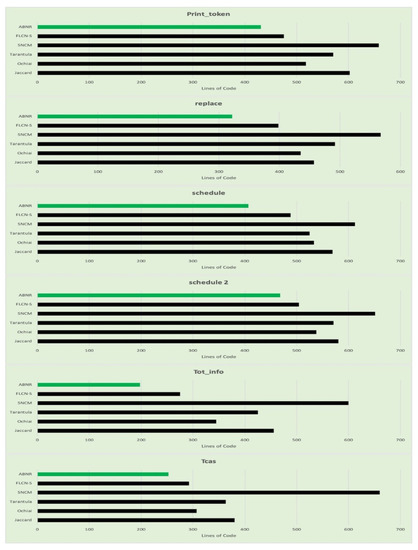 The performance of the proposed ABNR model is also evaluated against the Unix utility application programs. The model has recognized the faulty statements in the code snippet by evaluating the fewer lines of code, which needs comparatively lesser computational efforts and is much faster than its counterparts. The details about the number of lines of code evaluated for Unix applications are presented in Table 7, and the corresponding graphs are presented in Figure 6.