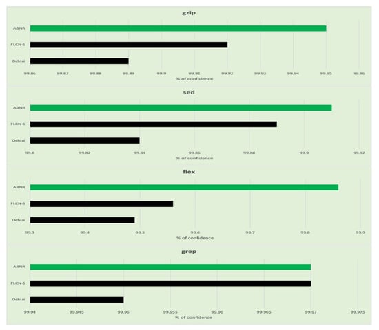 A lexical analyzer is what the flex program does. The input files were created of rules, which are collections of regular expressions and C code. There are 13,892 lines of code in all, and 525 test inputs are provided. Patterns and files are the two input parameters for the grep program. Every file that includes a match to one of the patterns has lines printed by the software. Lines of code: There are 12,653, and 470 inputs provided [40]. Real and injected errors will now be included in Unix utility applications. The details of the subject programs considered in the proposed model evaluation are presented in Table 4 [41,42]. The normal and vulnerable program statements are the samples that are used in the both the training and the validation phase of the proposed model. Training data contains 60% of the original data samples of the code. The overall samples are indeed made up of a 60% training dataset and a 40% validation dataset chosen at random from normal and defective samples. The remaining 40% of the original dataset is the testing dataset assumed as the unseen portions used to assess the ABNR fault localization performance.