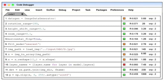 The proposed fault localization model through the aggregation-based neural ranking method is incorporated in the code editor names code debugger to evaluate the faults in the code snippet. The fault localization model would update the ranks for each corresponding statement in the code snippet on evaluating the code. The color box represents the severity of the error or bug corresponding to the code. The orange color denotes the possible fault or the vulnerability associated with the code statement, and the red color represents the faulty statement. The green color represents the error-free statements, and the variable “snp” denotes the snippet of the corresponding program. Figure 9 denotes the front end of the practical implication model.