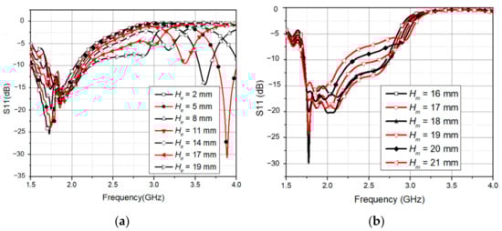 The first resonance at 1.85 GHz was created by optimizing the length of the two dipoles. Then, we increased the distance He between them, which created the second resonance as shown in Figure 2a. Then, to obtain the second resonance at 2.7 GHz, He was selected as 19 mm. The antenna impedance was mainly influenced by Ws, Hd, and Hm. As demonstrated in Figure 2b, the placement of the feeding point Hm had a significant effect on the input impedance from 1.8 GHz to 2.7 GHz. The impedance of the antenna element was well matched with 50 Ω of the SMA connector when Hm equals a quarter wavelength at 2.1 GHz. All of these dimensions were then optimized to obtain the desired bandwidth from 1.8 GHz to 2.6 GHz. The final antenna geometry after optimizing is shown in Table 1.