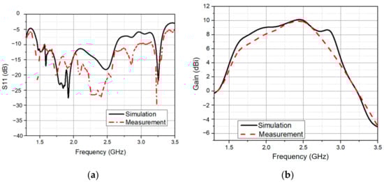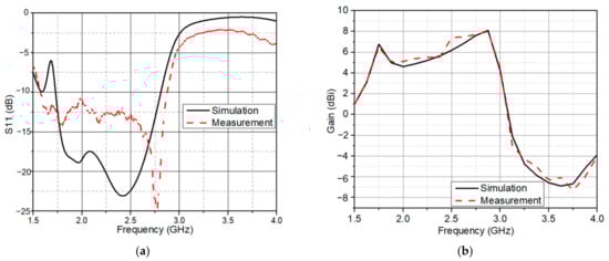 (a) Simulated and measured reflection coefficient; (b) simulated and measured antenna gain.