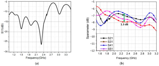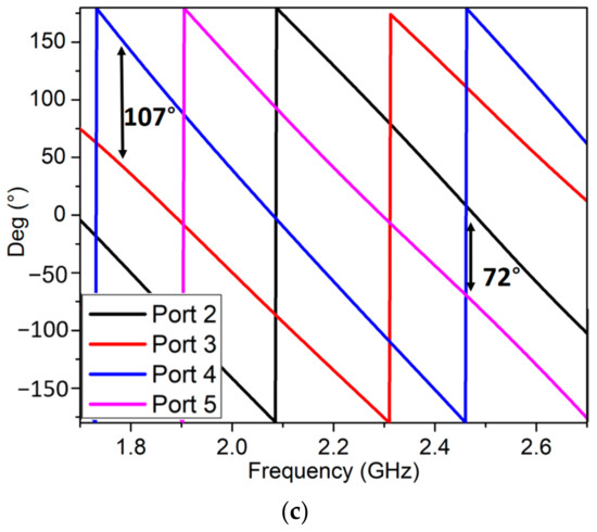 The reflection coefficient of the feeding network is shown in Figure 5a. At 2.3 GHz, a minimum reflection coefficient of −26 dB was obtained. The excitation of four dual-dipole elements had an amplitude close to the predicted −7 dB as shown in Figure 5b. In addition, they were nearly equal to each other from 1.8 GHz to 3.0 GHz. The power was distributed evenly between the four ports by the feeding network; however, some losses in the isolation resistors and long transmission lines cause the output phases to shift. The achieved output phases for four elements are shown in Figure 5c. The phase delay between two inputs of four pairs port 2/port 3, port 3/port 4, and port 4/port 5 was roughly 90°. This phase difference was 107° of maximum at 1.8 GHz and 72° of minimum at 2.45 GHz. It interprets why the proposed antenna array has the CP at this band.