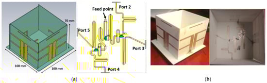 (a) Proposed 3D antenna and 2D feeding network; (b) fabricated antenna.
