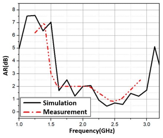 In this section, we attached the hybrid feeding network to four elements. This is illustrated in Figure 6a. It is worth noting that the elements were also oriented in a sequential rotation fashion. Figure 6b depicts an image of the manufactured 2 × 2 array with the sequential feeding network. The total size of the proposed antenna was 100 mm × 100 mm × 70 mm. The simulated and measured S11 are shown in Figure 7a. The proposed antenna had a wide bandwidth from 1.46 GHz to 2.63 GHz (57.3%) in simulation and 1.4 GHz to 2.95 GHz (71.2%) in measurement. In the 1.6–2.85 GHz frequency range, the antenna gain ranged from 6 dBi to 9.9 dBi. In addition, the peak gain was 9.9 dBi at 2.45 GHz as shown in Figure 7b. In Figure 8, with sequential rotation, the AR bandwidth of the array was smaller than 3 dB within the wide band of 1.5–2.9 GHz (63.6%).