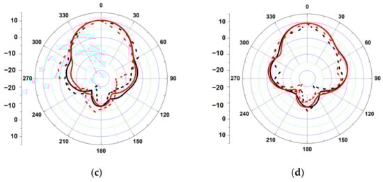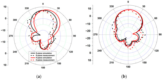 As a result, by employing the sequential rotation method, the AR performance was significantly improved. The E-plane and H-plane radiation patterns of the array antenna at 1.8 GHz, 2.1 GHz, 2.45 GHz, and 2.6 GHz are shown in Figure 9. At those bands with half-power beamwidths (HPBW) of roughly 63.6°, 57.9°, 51.9°, and 47.5°, respectively, the antenna was more focused toward the director. The simulation and measurement were quite similar.