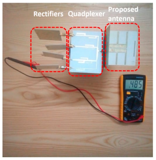 We proposed a quad-band rectenna working at 1.8 GHz, 2.1 GHz, 2.45 GHz, and 2.6 GHz, four common frequency of bands available in the environment, formed by the proposed wideband circularly polarized antenna, the quadplexer, and four single rectifiers. The quadplexer helps separate the four frequencies and transfer them to corresponding rectifiers. The rectifiers are single-banded, so they are easy to design and also likely to achieve good performance. The proposed quad-band rectenna is shown in Figure 12.