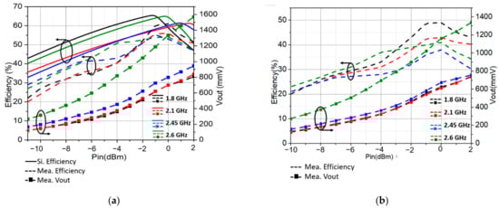 We investigated the advantages of employing the 2 × 2 circular polarized array for RF energy harvesting in self-power devices. As shown in Figure 13a, the highest simulated AC–DC efficiency of the 1.8 GHz rectifier is 65% at −1 dBm input power, for the 2.1 GHz it is 64%, the 2.45 GHz is 61%, and the 2.6 GHz is 61%, respectively. The maximum measured AC–DC efficiency was 60%, 55%, 55%, and 54% at −1 dBm, 0 dBm, −1 dBm, and 0.5 dBm input power, respectively. The highest reported RF–DC output voltage was 1568 mV at 2 dBm, occurring with the 2.6 GHz rectifier. After connecting the rectifiers to the quadplexer, forming a quad-band rectifier, the AC –DC efficiency slightly decreased to 49%, 43.5%, 41%, and 38% for the 1.8, 2.1, 2.45, and 2.6 GHz bands at −0.5 dBm input power, as shown in Figure 13b.