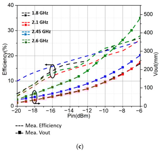 (a) Simulated and measured AC–DC efficiency of the rectifiers; (b) measured AC–DC efficiency of the quadplexer and rectifiers; (c) measured RF–DC efficiency.