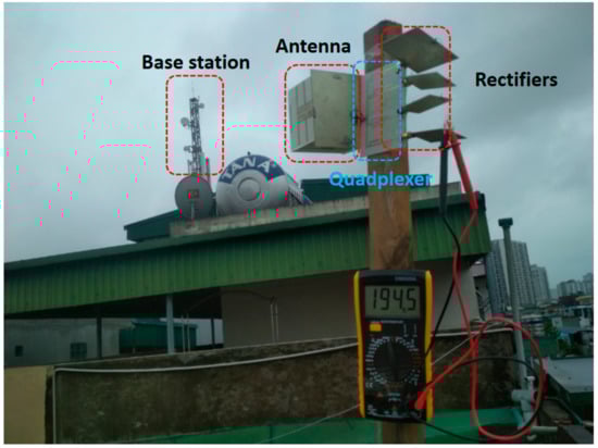 In the full system testing, the proposed wideband and CP antenna were connected to the quadplexer and four rectifiers to form the multiband rectenna prototype via SMA connectors, as shown in Figure 12. A signal generator excited monotone incident waves via a reference antenna. The RF–DC efficiency was smaller than the AC–DC due to the loss on the connectors and quadplexer. The maximum RF–DC efficiency was 27%, 26%, 25.5%, and 27.5% at −6 dBm, respectively, as in Figure 13c. The maximum measured voltage was 484 mmV at 2.6 GHz, at nan input power level of −6 dBm. This result shows its potential for a self-powered wireless sensor when connecting with a power management circuit. The quad-band rectenna was also tested in the ambient environment, 70 m from the base station. The rectenna collected and harvested the 3G and 4G waves transmitted from the base station, along with the Wi-Fi signal in the surrounding houses into DC votltage. The maximum recorded voltage was 194.5 mV, corresponding to 47 µW power, as shown in Figure 14. When the rectenna is put closer to the base station, the amount of power gathered should be substantially higher. It should be noted that for practical application, the locations of the power sources are unknown. For locations very close to power sources, such as base stations, the harvested power can be high enough to support a wireless sensor, which consumes several milliwatts in full active mode. For our experiment, the distance from the rectenna to the power source was quite far away; therefore, the harvested power was not enough to supply any sensor. However, it was enough for low-power wireless sensors in sleep modes, which only need several microwatts [33,34].