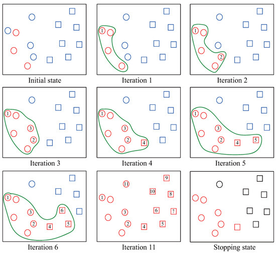 In Figure 4, at the initial state, the three red circles indicate the original PL set and all the blue instances indicate U set. In each iteration, the unlabeled instance which is closest to PL is labeled as positive and added to PL. For example, in iteration 1, the circle-1 is labeled because it is now closest to PL. We can observe that the labeled set PL is augmented gradually until all instances are labeled. After labelling all the instances in the set U (iteration 11), the stopping criterion calculates the stopping point to build the final positive set and negative set. Specifically, in our example, the value of stop is equal to 4 and at the stopping state, all red instances indicate the positive set while the rest are labeled as negative set.