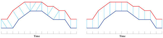 In DTW, an alignment from time-series to time-series is described by a warping path: , where L is the length of the warping path. The element represents the alignment from in A to in B. The warping path must satisfy the following constraints [26,27].