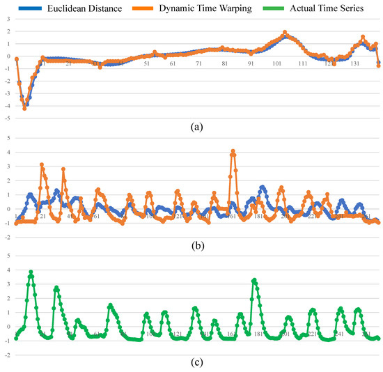 DTW [17,25] is the most popular distance in time-series, and performs well in similarity search because it allows time-flexible alignment and can find the best matching between two time-series by searching for optimal alignments; hence, it allows time-series to be locally shifted along the temporal axis and can handle time-series of unequal lengths. Figure 5 illustrates that compared with Euclidean Distance, DTW guarantees to obtain the optimal alignment between two time-series and .