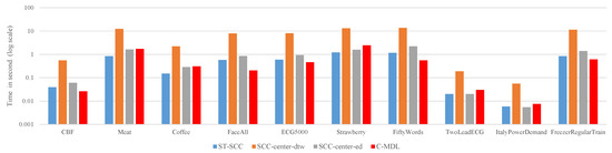 Efficiency is another criteria for assessing algorithms. In this subsection, we evaluate the running time of four approaches. The average time required to label each unlabeled time-series is recorded and the results can be found in Figure 8. The results show that SCC-center-dtw is significantly more time-consuming than ST-SCC, SCC-center-ed and C-MDL on all datasets as we expected. We note that ST-SCC is 9.3 to 15 faster than SCC-center-dtw. In our experiments, the number of iterations in DBA . Therefore, according to Equation (16), theoretically, the speedup obtained by ST-SCC is around 16. The results illustrated in Figure 8 generally confirm the time complexity analysis in Section 3.5.
