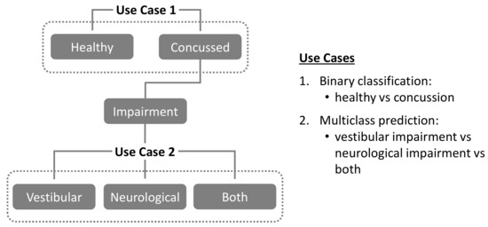 - In Use Case 2, the random assignment of the concussed individuals into training, validation, and testing datasets for multiclass prediction (“vestibular” vs. “neurological” vs. “both”) also maintained the original proportional balance in each dataset.