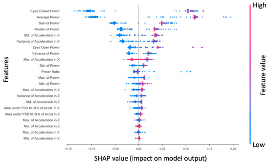Shapley additive explanations (SHAP) is a method for explaining how complex machine learning models make decisions with the data they receive by computing the magnitudes of the contributions from each individual feature to a model’s output [86]. Figure 2 presents the SHAP values for features derived from the x-axis phybrata signals of training set patients for the best performing RF model. Feature importance is ranked from top to bottom (left y-axis). The two most robust features in terms of their contributions to classification are the Ec power and average power, consistent with previous results [58]. The third and fourth most robust predictors were the sum and median power, which showed a similar pattern of values in relation to outcome. These power features are followed by the x acceleration features, particularly standard deviation and variance in the global x (A–P) signal. Notable features that were considered reasonably useful for RF training and prediction were eyes-open power, the variance of power, and the Ec/Eo power ratio. The y (vertical) and z (M–L) features were found to be less robust in prediction for RF. The actual values of the features (right y-axis) are suggestive that higher x (A–P) accelerations and phybrata powers (red) are linked with a prediction of concussion, while lower accelerations and powers (blue) and smaller x feature values are linked with a prediction of healthy, with the exception of the global minimum for x (Min. of Accel X) and z (Min. of Accel Z). Less significant z and y features for RF also appear clustered around the center axis at the bottom of the plot, indicating minimal predictive impact on model output.