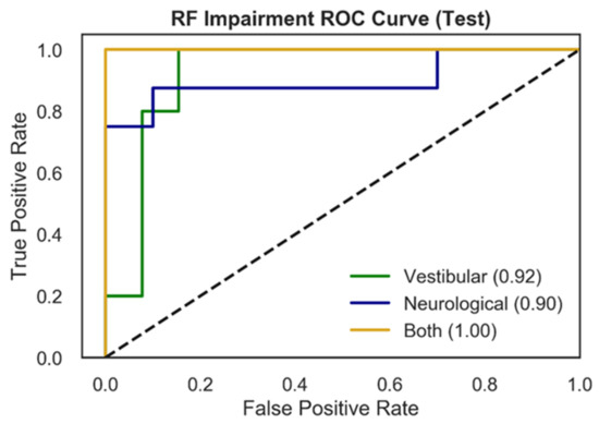 Figure 3 presents RF test ROC curves for the multiclass impairment prediction, with each curve representing the specific impairment vs. the other two diagnoses (vestibular vs. rest; neurological vs. rest; both vs. rest). ROC curves represent the tradeoff between the True Positive Rate (TPR) and False Positive Rate (FPR) for an optimized decision threshold. This decision threshold is learned during model training and translated to the testing set used to generate the curves in Figure 3. The area underneath each curve (AUC) in Figure 3 quantifies model performance in relation to TPR and FPR. Vestibular and neurological ROC curves showed AUC scores of 0.92, and 0.90 respectively, while the ROC curve for patients with both impairments exhibits an AUC of 1.00.