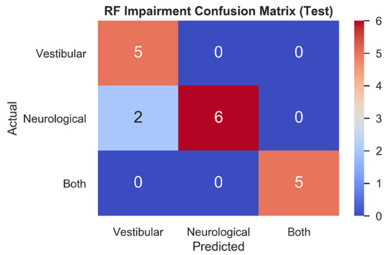 Figure 4 depicts the RF testing set confusion matrix (n = 18) for the three impairment classes. RF correctly classified all vestibular (1.0, 5/5) patients, most neurological (0.75, 6/8) patients, and all patients with both (1.0, 5/5) impairments. The two mistakes in the test set both relate to model predictions of vestibular impairments for patients who had been clinically diagnosed with neurological impairments.