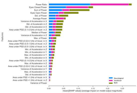 Figure 5 presents SHAP value rankings of feature importance for the multiclass application of the RF model using the NTS preprocessing pipeline. The Ec/Eo power ratio was clearly the most robust predictor overall in the NTS RF model, contributing significantly to the classification of neurological (SHAP = 0.14) and vestibular (SHAP = 0.13) impairments as opposed to both (SHAP = 0.01). Ec and Eo power features made the second and fourth-largest contributions, and also captured unique aspects of variation in each impairment that differ from the Ec/Eo power ratio. In particular, Ec power contributed to neurological (SHAP = 0.05) and vestibular (SHAP = 0.08) impairment classifications, but very little for individuals with both (SHAP = 0.02). Conversely, Eo power and Sum Power account for individuals with both (Eo SHAP = 0.05; Sum power SHAP = 0.06) significantly better than Ec power, slightly less for neurological (Eo SHAP = 0.03; Sum power SHAP = 0.05) and significantly less for vestibular (Eo = 0.02; Sum power SHAP = 0.02) impairments. Finally, standard deviation of power and Average Power (Ec + Eo)/two rounded out the top six features for predicting neurological impairment (Std. power SHAP = 0.02; Average power SHAP = 0.02), vestibular impairment (Std. power SHAP = 0.01; Average power SHAP = 0.03) and both impairments (Std. power SHAP = 0.03; Average power SHAP = 0.01). The highest-ranking phybrata frequency band feature is the “Area under PSD (0.1–0.5) Hz of Accel. in z”, which is the frequency band corresponding to vestibular regulation of postural control. It is important to note here that the relative contribution of various phybrata features to specific impairments may be related to the ML model as well as the data consumed by the model, so that the SHAP value rankings shown in Figure 5 may change for different ML models.