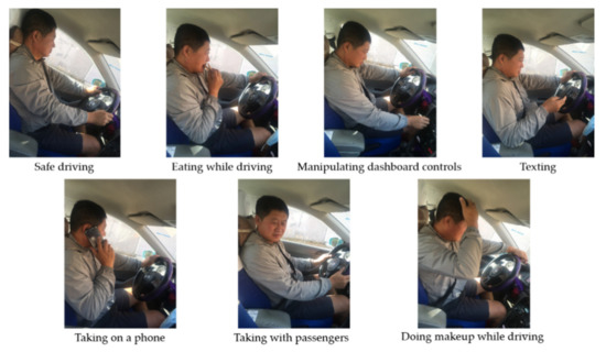 The literature shows that the driver’s distracted actions mainly include eating, drinking, manipulating dashboard controls, watching a smartphone screen, talking on a phone or with passengers, and grooming [37]. Therefore, in this study, the above seven actions are selected as the distracted actions to be recognized. The State Farm Distracted Driver Detection dataset published on Kaggle [38] and the American University in Cairo (AUC) Distracted Driver Dataset [39] are the most frequently used datasets in the related studies. However, they cannot meet our needs because of the following two reasons. First, the images in the dataset extracted from the same video are almost identical to each other. Second, there is no timestamp information or sequence information about the images [21,39,40]. Therefore, we created a new dataset. In order to make our data collection reasonable, the custom dataset is collected by mimicking the State Farm dataset (e.g., the camera perspective, distance, and the scenarios).