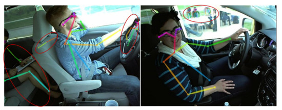 Objects or pedestrians are sometimes mistaken for human skeletons by OpenPose, causing multiple human skeleton information to be stored in the json file. To cope with this phenomenon, we compared a large amount of data and found that the skeleton information with the highest confidence is displayed on the first line of the json file. In other words, the skeleton information is sorted by confidence, which reaches the threshold but has the lowest confidence is arranged at the end of the file. Since the focus of the video is on the driver, it is clear that the driver’s skeleton is the most obvious and the confidence is the highest. Therefore, the first human skeleton information in the file is always retained.
