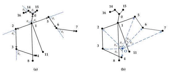 This paper constructs 13 vector angles, as shown in Figure 6. Additionally, taking the number 3 (right elbow) joint point as an example, is the angle between the upper arm and the forearm in Figure 6a, which can be used to measure the swing angle of the forearm relative to the upper arm. and in Figure 6b respectively represent the angular relationship of the right elbow joint with respect to the right shoulder, right wrist, and point . The unique position of the joint point can be determined by the above three vector angles.