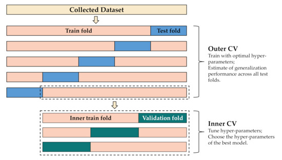 The process for the nested cross-validation technique is shown in Figure 8. Our dataset is randomly split into five non-overlapping groups in the outer loop. In each group, two dissected subsets are called training sets and test sets respectively, and test sets are dedicated to model evaluation. In each iteration of the internal CV loop, the input training set is repeatedly split into validation and inner training sets using the threefold CV method. What is remarkable is that we divided samples of the dataset into five parts or three parts by action performers instead of randomly dividing. Table 5 shows the range of hyper-parameters. The selected values of three hyper-parameters to be optimized were combined to form various combinations. the inner training folds are used to derive different models by manually adjusting the hyper-parameters, while the validation set is used to estimate the performance of the model. The hyper-parameter corresponding to the highest classification accuracy of the inner CV loop is selected as the optimal hyper-parameter to train the external CV loop.