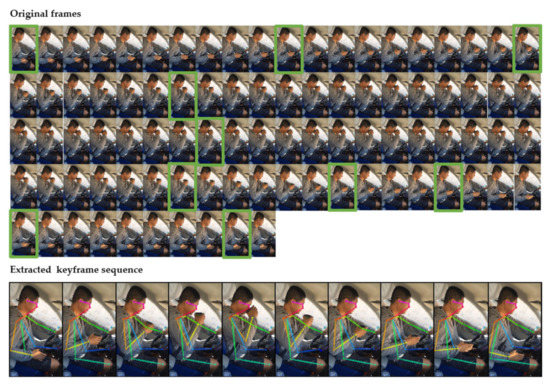 Many studies have shown that using only a few keyframes instead of a complete sequence of frames can perform action recognition tasks more effectively and summarize the video [27,28,29,30,31,32]. Kim et al. [33] prove that the keyframe extraction enables fast and robust gesture recognition regardless of motion speed. Wang et al. [34] extract an energy feature, combining kinetic energy and potential energy, from 3D video sequences to represent human actions and employ a support vector machine (SVM) to recognize human actions on the EFs of selected keyframes. Tang et al. [35] combine image density clustering and entropy and use keyframes in gesture videos for further feature extraction to improve recognition efficiency. Yasin et al. [36] extract the keyframes that contribute to the action performance from the motion sequence of the 3D frame to eliminate redundant frames and summarize the motion sequence while retaining the original motion semantics. It can be seen that the keyframes should be representative of the video content, diverse to reduce the redundancy, and should be able to cope with the impact of movement speed on recognition.