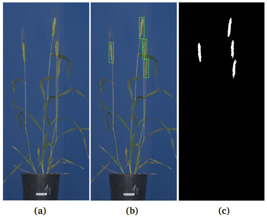 Example of spike detection and segmentation in greenhouse wheat images: (a) RGB visible light image of a matured wheat plant, (b) detection of spikes by rectangular bounding boxes, (c) pixel-wise segmentation of spikes.