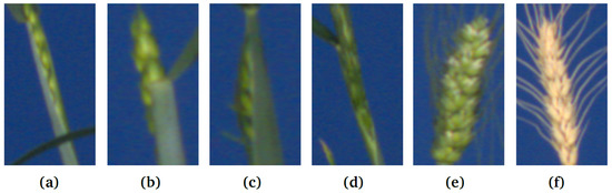 Examples of spike ROIs from the test image set: (a–d) emergent, partially visible spikes vs. (e,f) matured spikes (GSGC, YSYC).