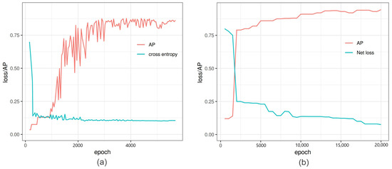 In the second stage of Faster-RCNN, exponential decay is used as a learning parameter for training images. The features computed in RPN are passed through an ROI pooling layer and turned into a feature vector for the fully connected layer in the main detector. Finally, a softmax layer produces a binary output assigned with a set of class probabilities, and the regressor computes a bounding box with accurate coordinates. Typical curves of in-training loss and average precision during the training process of Faster-RCNN are depicted in Figure 3a.