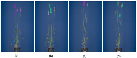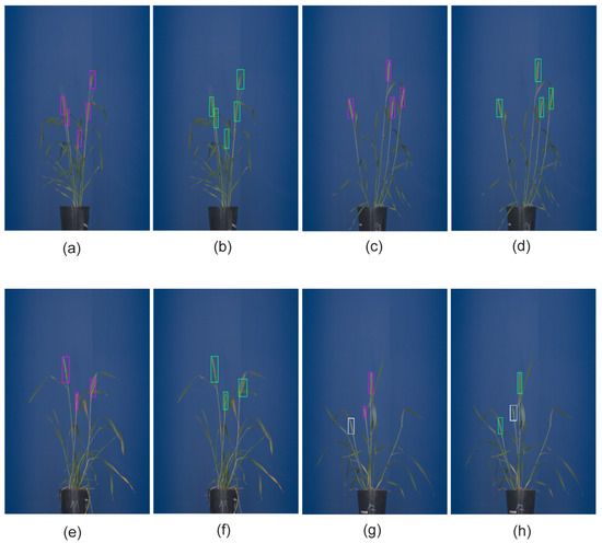 The detection of grain spikes using pre-trained Faster-RCNN (green bounding boxes) and YOLO (pink bounding boxes) DNN: (a–d) examples of detection of top wheat spikes, (e–h) examples of detection of emergent wheat spikes White bounding boxes indicate spikes that were not detected by the DNN classifier in this particular image.