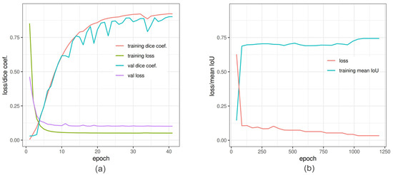 In-training accuracy of U-Net and DeepLabv3+ versus epochs: (a) Dice coefficient (red line) and binary cross-entropy (green line) reached pleateau around 35 epochs. The training was also validated by Dice coefficient (light sea-green line) and loss (purple line) to avoid overfitting. (b) Training of DeepLabv3+ is depicted as function of mean IoU and net loss. The loss converge around 1200 epochs.