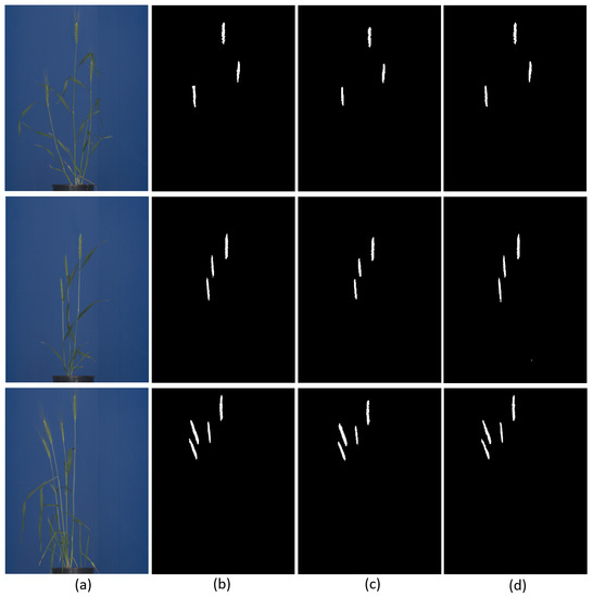 In total, 255 RGB images in the original image resolution of 2560 × 2976 were used for training and 43 for model evaluation. In this study, DeepLabv3+ was trained for 2000 epochs with a batch size of 6. The polynomial learning rate was used with weight decay of . The output stride for spatial convolution was kept at 16. The learning rate of the model was to with weight decay of and momentum of 0.90. The evaluation metrics for in-training performance was mean IoU for the binary class labels, whereas net loss across the classes was computed from cross-entropy and weight decay loss. ResNet101 was used as the backbone for feature extraction. On the test set, DeepLabv3+ showed the highest aDC of 0.935 and Jaccard index of 0.922 among the three segmentation models. In segmentation, the DeepLabv3+ consumed more time/memory (11 GB) to train on GPU, followed by U-Net (8 GB) and then ANN (4 GB). Examples of spike segmentation using two best performing segmentation models, i.e., U-Net and DeepLabv3+, are shown in Figure 7.