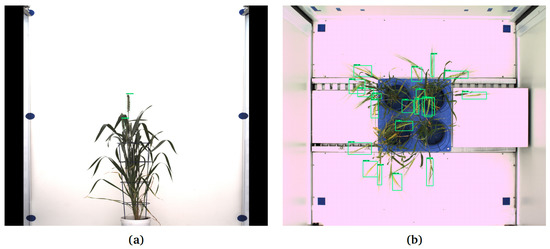 Figure 8. Examples of application of Faster-RCNN trained on data set in Table 2 for the detection of spikes of Central European wheat cultivars in images with different (white) background: (a) DNN failed to detect some spikes in the side view image, (b) early emergent spikes and some matured spike in the top view remained undetected.