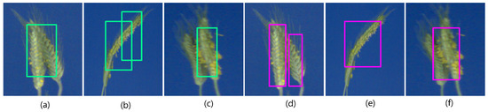 Overlapping/occluding spikes in barley/rye dataset: (a–c) Faster-RCNN failed to detect overlapping spikes as separate objects in the majority of cases and (d–f) YOLOv3, sometimes managed to separate occluding spikes as in (d).