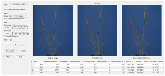 Three out of six neural network models investigated in this study, namely, YOLOv3 for spike detection as well as ANN and U-Net for spike segmentation, were integrated into a GUI-based software tool (SpikeApp), not only demonstrating the performance of these three models, but also calculating over 70 phenotypic traits of detected spikes regions in terms of color, shape and textural descriptors. Figure 11 shows the screenshot of the SpikeApp, which can be downloaded along with example images from https://ag-ba.ipk-gatersleben.de/spikeapp.html (accessed on 1 November 2021, Gatersleben, Germany).