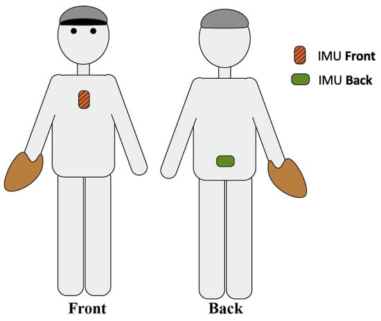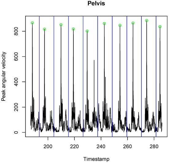 The pitching motion was recorded using two 9-DOF IMUs (MPU-9150, Invensense, San Jose, CA, USA, Accelerometer ± 16 g, Gyroscope ± 2000 deg/s). Sensors were rigidly attached to pelvis and sternum (Figure 1) using double-sided adhesive tape and used to record body segment rotation. Every sensor was embedded in a protective casing together with a battery and SD-card, onto which the data were logged at a sample frequency of 500 Hz. IMU’s gyroscope recorded angular velocities continuously throughout the participant’s session. Previous studies used peak values of kinematic measures to address their effect on the ball velocity in baseball pitching [2,6,7,10]. Therefore, for the gyroscope signal, we calculated the peak angular velocity as its Euclidean norm. Each recording was manually segmented into parts containing only a single pitch. We performed the segmentation by plotting the entire gyroscope signal and locating the 10 peaks each corresponding to a pitch (see Figure 2). This was done in a similar way in [11] for ball velocity data obtained in handball.