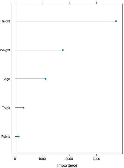 At the same time as including repeated measurements of segment rotation per participant, the multilevel approach enables us to examine the added value of the individuality in ball velocity prediction. Group-level predictors were selected among personal characteristics that were collected prior to the measurements. We addressed the high correlation between pitcher’s height, weight and age. It is reasonable to expect that older pitchers will be taller and therefore weigh more. To select group-level predictors and avoid poor prediction performance due to correlation of predictors, we applied a random forest (see for instance chapter 8 in [15]), as implemented in the caret package [16]. Based on variable importance (Figure 3) calculated with varImp from a caret package, we selected pitcher’s height as a group-predictor. We developed three multilevel Bayesian regression models for ball velocity prediction using R 4.0.3 [17] and rstanarm [18,19].